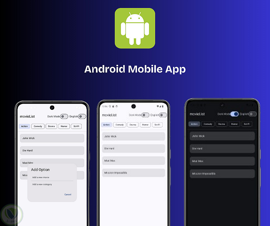 تطبيق اندرويد يعرض افلام مقسمين لاقسام(اكشن-كوميدي-...)مربوط ب database ويمكن اضافة افلام او قسم جديد وبه وضع داكن