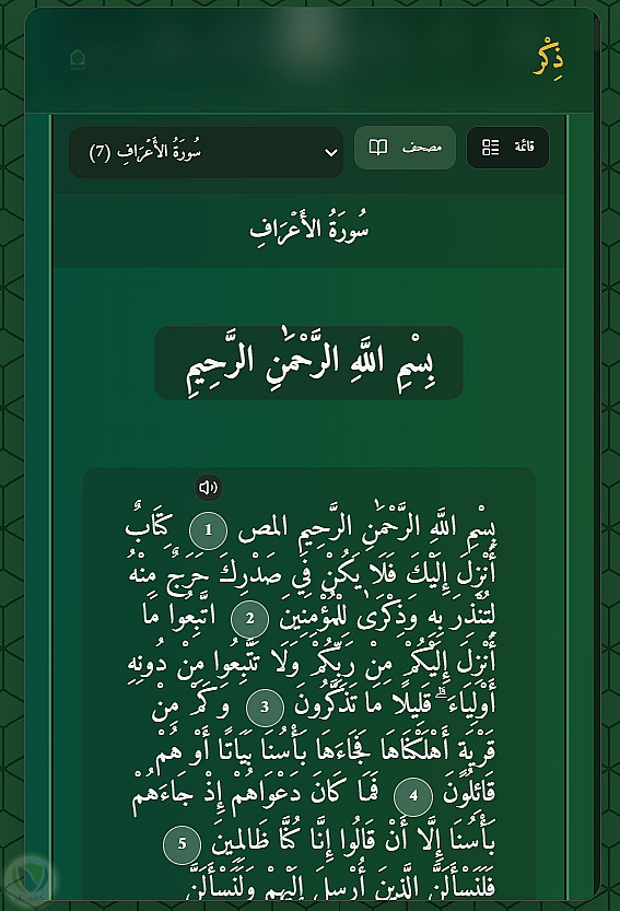 • القرآن الكريم كامل مع إمكانية القراءة والاستماع لكل آية