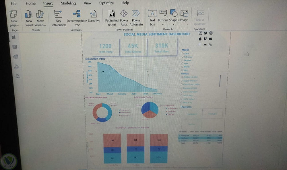 أقدم لك لوحة تحكم تفاعلية بعنوان "لوحة تحليل مشاعر وسائل التواصل الاجتماعي" (Social Media Sentiment Dashboard) تم تصميمها باستخدام Power BI، لعرض وتحليل أداء المحتوى على منصات التواصل الاجتماعي مثل Instagram، Twitter، وYouTube.
