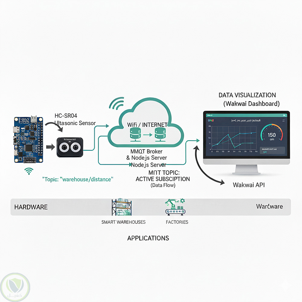 نظام إنترنت أشياء لمراقبة المسافات في الزمن الحقيقي باستخدام وحدة ESP32 وحساس Ultrasonic. يتم إرسال البيانات عبر بروتوكول MQTT إلى خادم Node.js، وتُعرض على لوحة تحكم Wakwai لمتابعة القياسات بشكل مباشر. يمكن استخدام النظام في المستودعات الذكية أو المصانع.