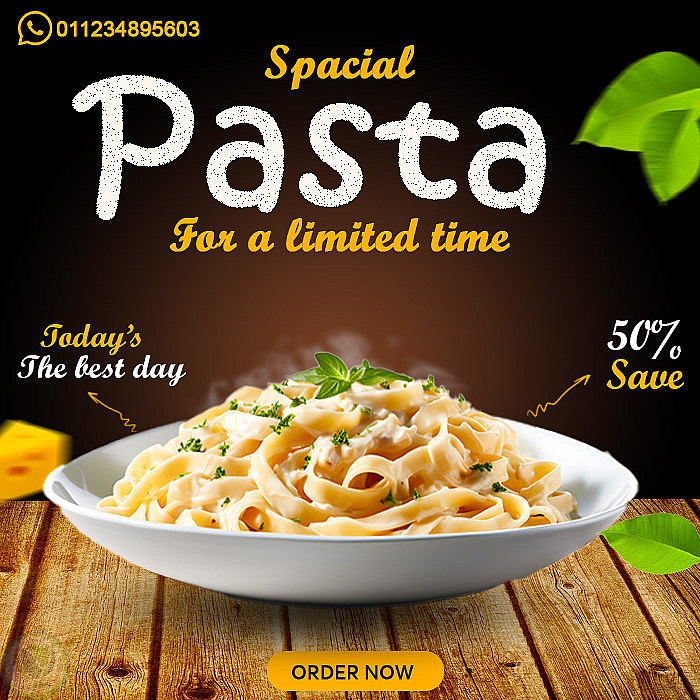 تم تصميم هذا الإعلان ليكون محتوى جذابًا ومُلفتًا للنظر، يستهدف الترويج لعرض خاص ومحدود لوجبة باستا مميزة. يهدف التصميم إلى زيادة المبيعات والطلب الفوري من خلال إبراز الجودة والمذاق بالإضافة إلى عنصر التوفير (خصم 50%).