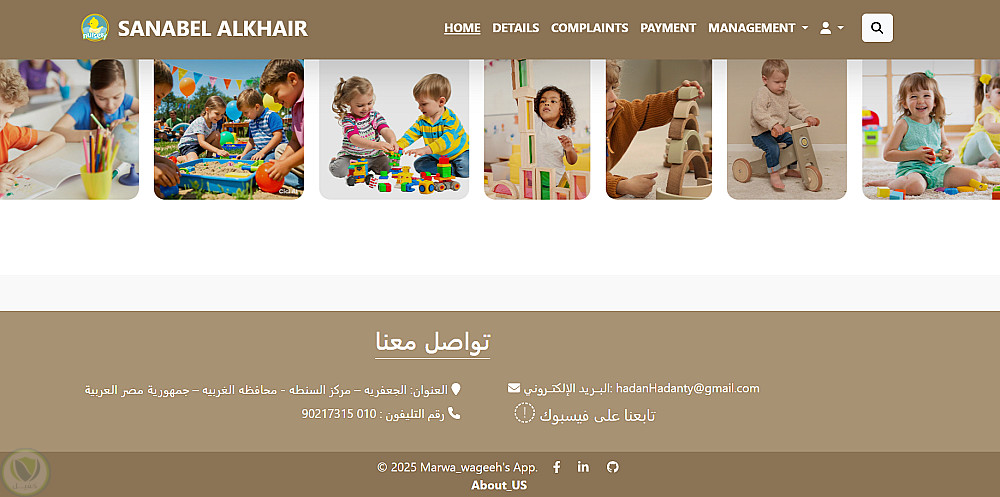 نظام إدارة حضانة عبر الويب تم تطويره لحضانة حقيقية، بالاعتماد على بحث ميداني ومقابلات مع المسؤولين. تم تصميم قاعدة البيانات بشكل واقعي وقابل للتوسع لتلبية الاحتياجات التشغيلية اليومية للحضانة.