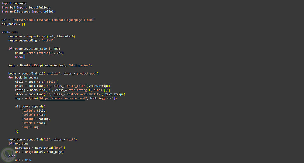 - جمع البيانات الأساسية لكل كتاب ويتضمن (اسم الكتاب، السعر، حالة التوفر (متاح أو غير متاح)، رابط لغلاف الكتاب) ثم الانتقال لكل الصفحات.