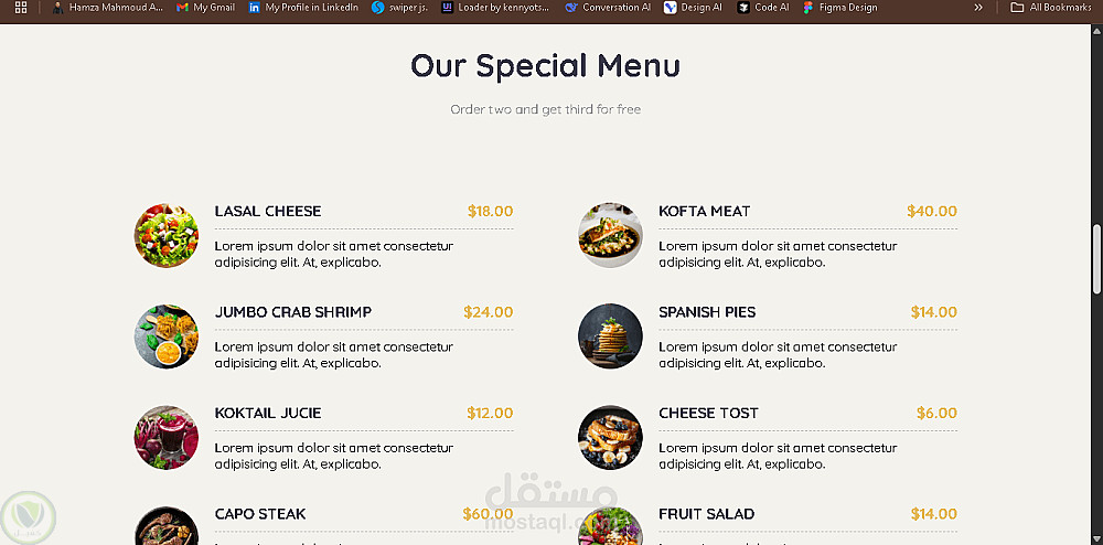 يتميز بتصميم متجاوب يناسب جميع الأجهزة، ويمكن استخدامه كقالب لمطعم، مدونة طعام، أو مشروع تجريبي في تطوير الواجهات.