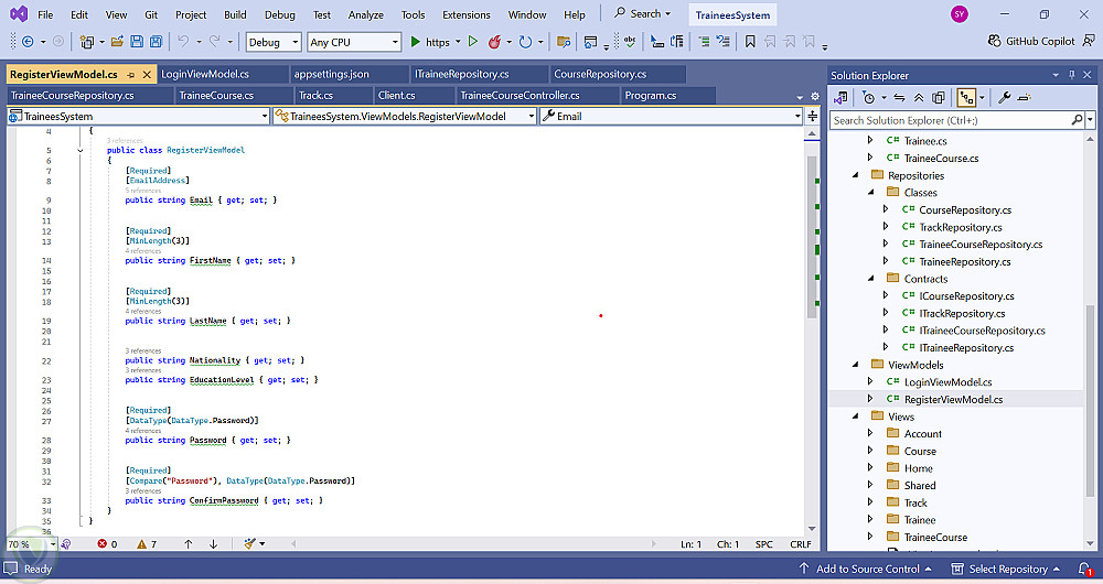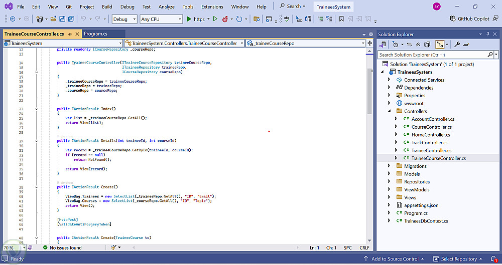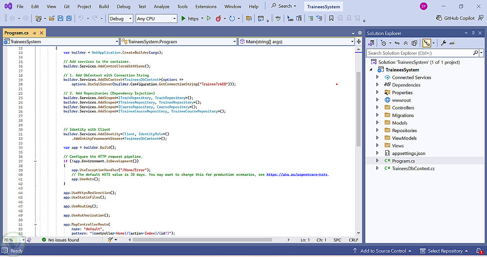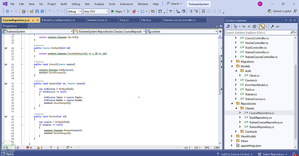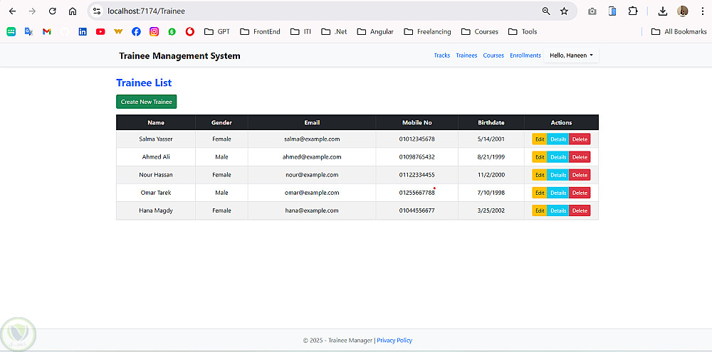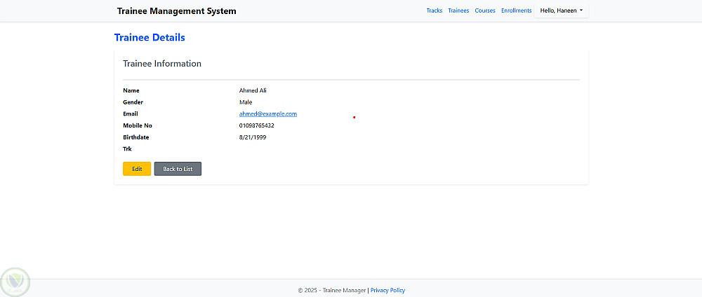 قمت بتصميم وتطوير تطبيق ويب متكامل لإدارة المتدربين والمسارات والدورات التدريبية داخل المؤسسات التعليمية والتدريبية. يتيح النظام إضافة وتحديث وحذف واستعراض بيانات المتدربين، المسارات، والدورات من خلال واجهة استخدام سهلة ومنظّمة. تم تطبيق جميع عمليات CRUD باستخدام إطار العمل ASP.NET Core MVC النظام يوفّر لوحة إدارة فعّالة تمكّن من متابعة المتدربين، معرفة المسار المنضم إليه كل متدرب، وتقييم أدائه في كل دورة تدريبية، مما يسهّل تنظيم العملية التعليمية والإدارية بشكل متكامل.