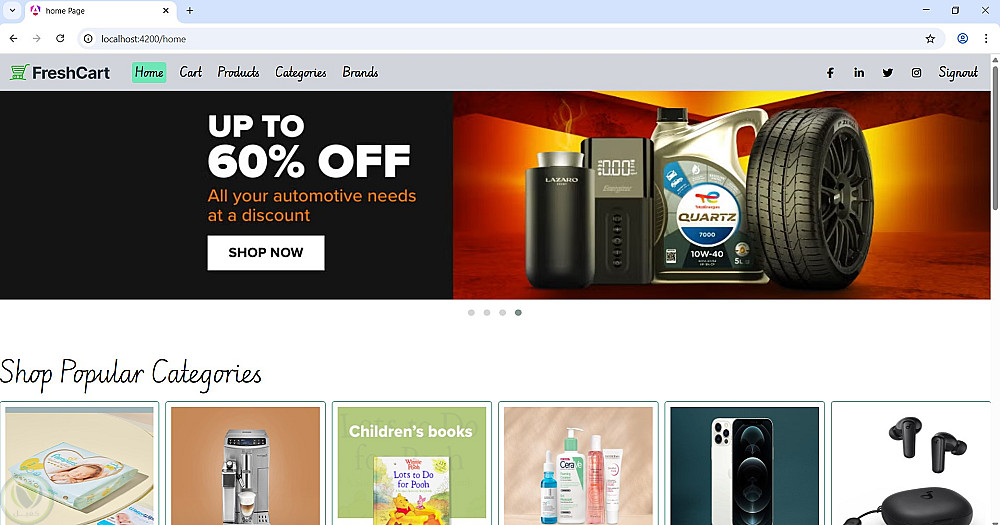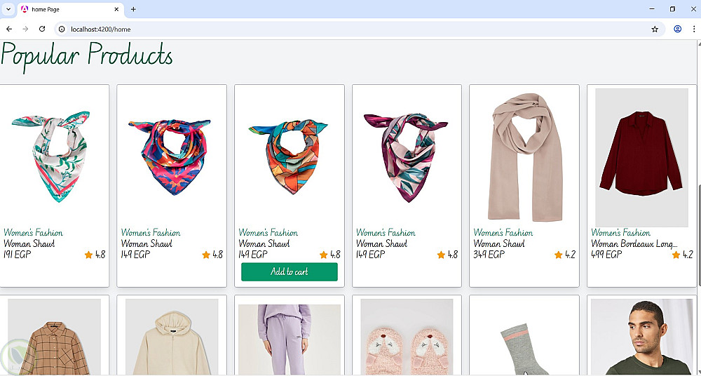تم تطوير تطبيق ويب للتجارة الإلكترونية (E-Commerce Web App) بواجهة أمامية احترافية باستخدام Angular 20، يتيح للمستخدمين تصفح المنتجات وإدارتها بطريقة سلسة وجذابة.