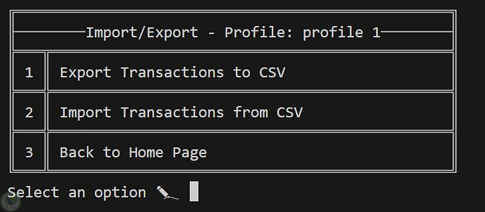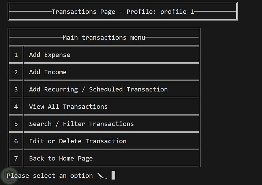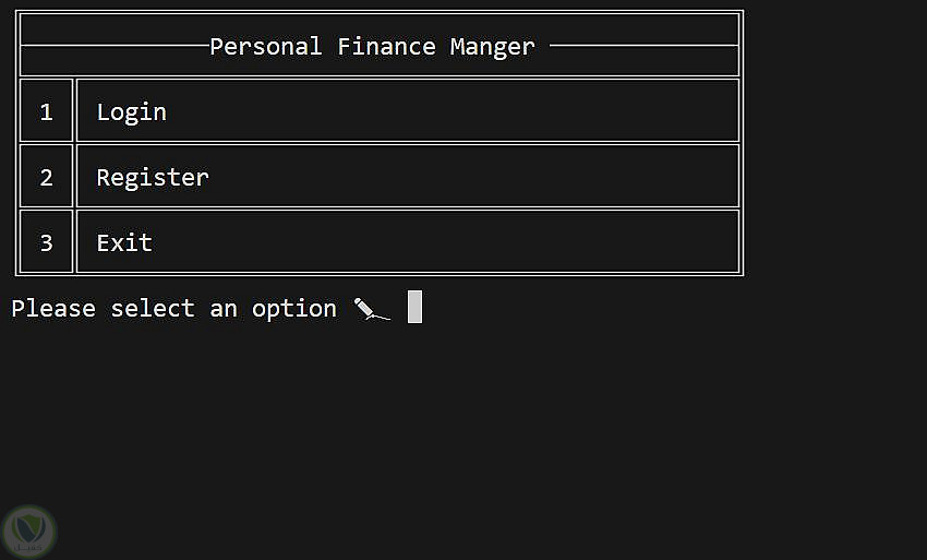 مدير ميزانية شخصية يعمل من خلال واجهة سطر الأوامر (Console)، يساعد المستخدمين على تتبع الدخل والمصروفات وأهداف الادخار بكفاءة، وذلك عبر واجهة قائمة بسيطة وسهلة الاستخدام.