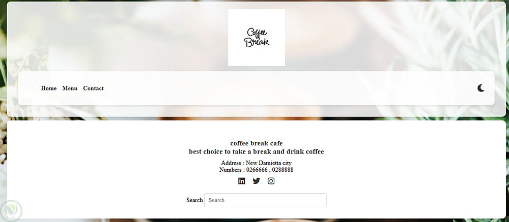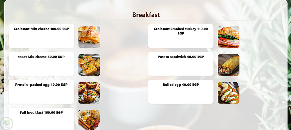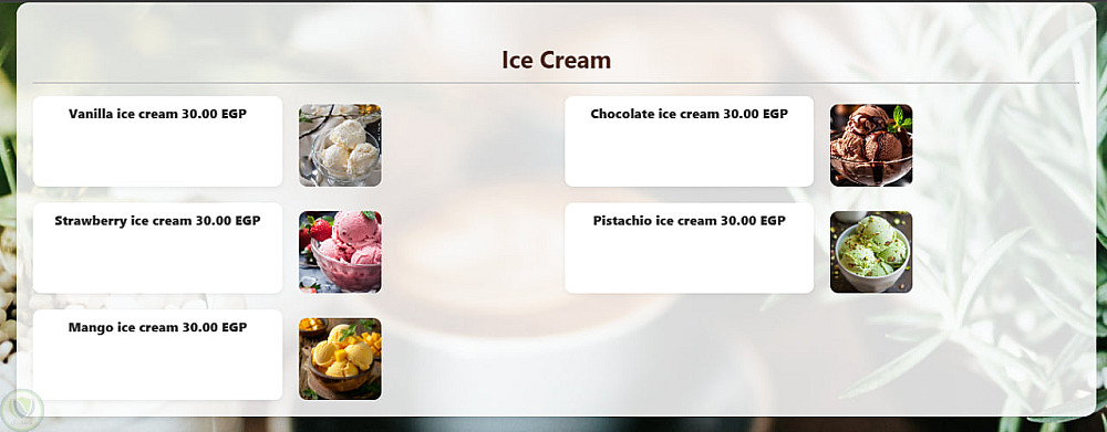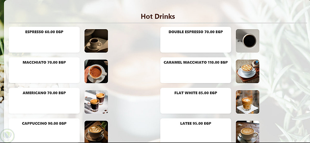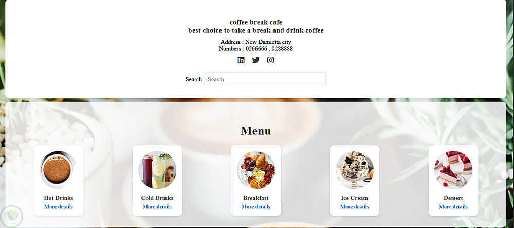 موقع إلكتروني لقائمة رقمية (Menu) ، يتضمن الموقع شعار المقهى، ومعلومات تعريفية عنه، وروابط إلى حساباته على مواقع التواصل الاجتماعي، بالإضافة إلى محرك بحث يُسهّل على العملاء الوصول إلى المشروب أو الوجبة التي يرغبون بها دون الحاجة لتصفح جميع الأقسام.