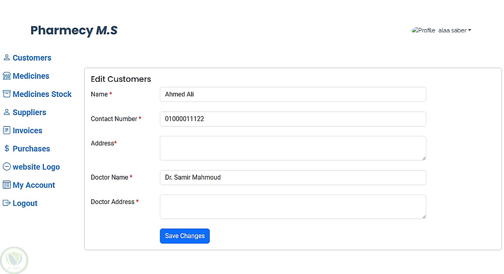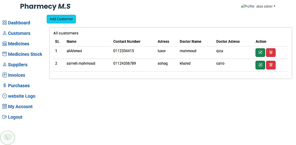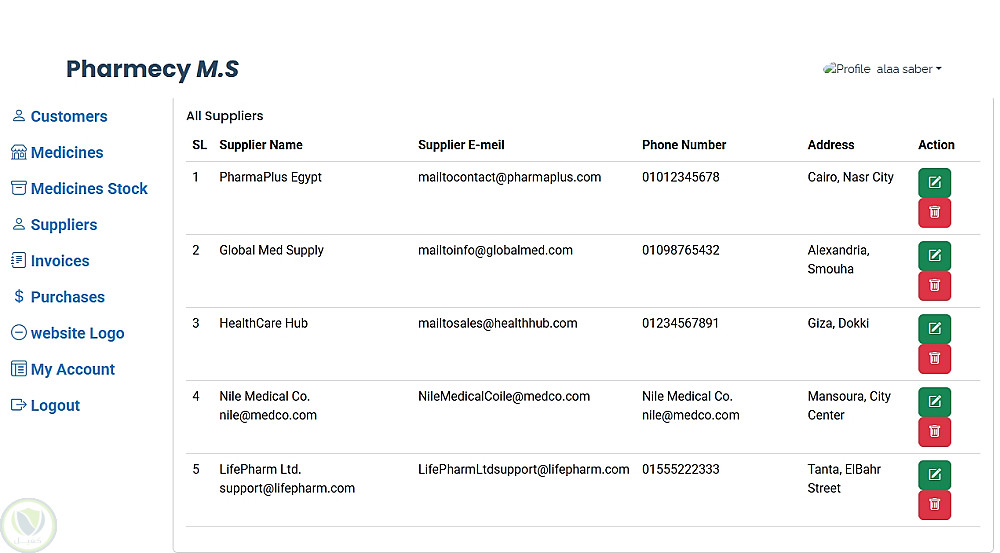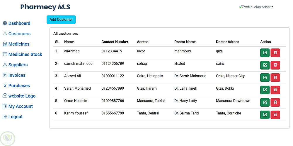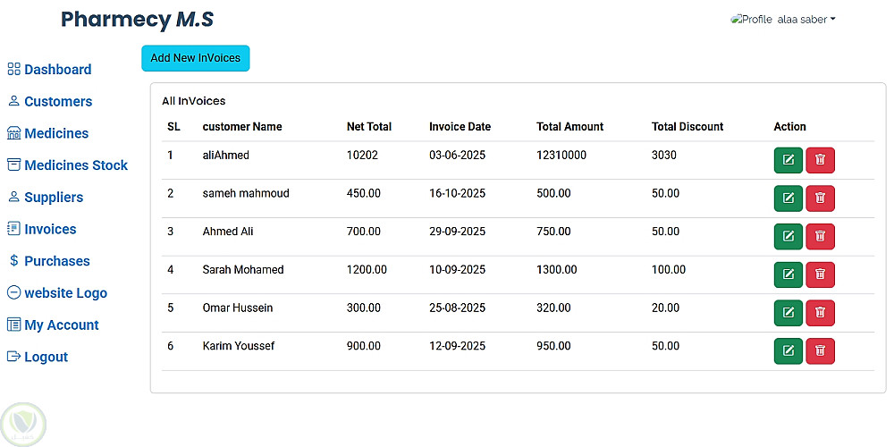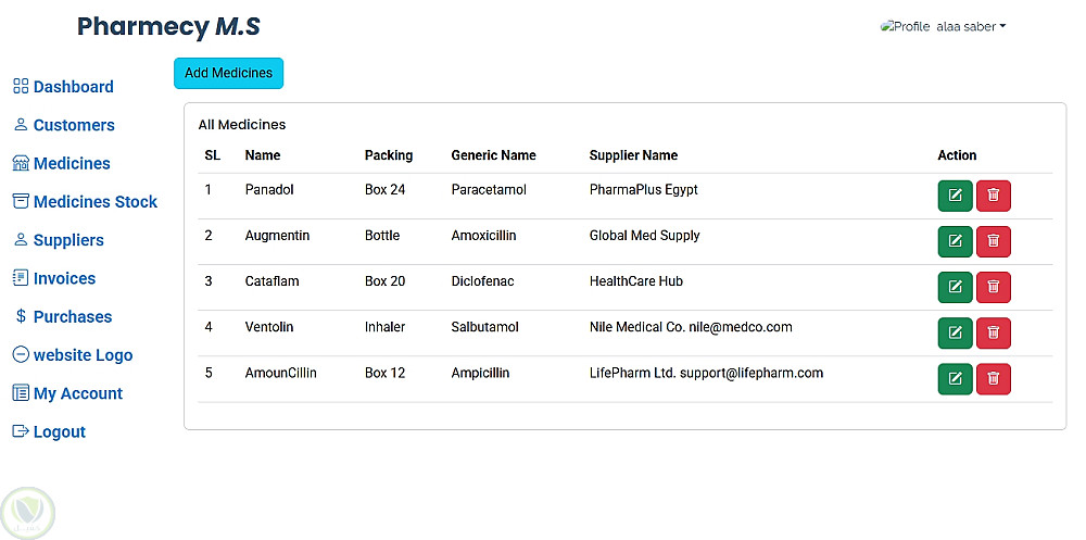 Pharmacy Management System هو تطبيق ويب لإدارة الصيدليات يعتمد على Laravel، ويقدم معالجة شاملة للبيانات اليومية مثل العملاء، الأدوية، المخزون، والمشتريات، مع واجهة أمامية بسيطة ومنظمة مبنية بـ HTML, CSS, Bootstrap، وقاعدة بيانات MySQL.