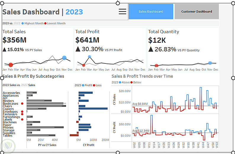 قمت بتصميم لوحة تحليل مبيعات شاملة باستخدام Tableau لعرض أداء المبيعات والربحية لعام 2023 مقارنة بعام 2022.