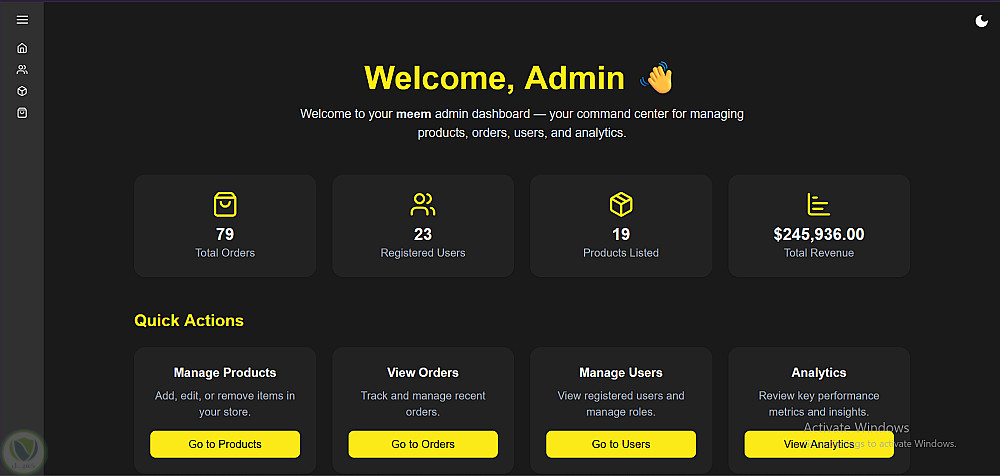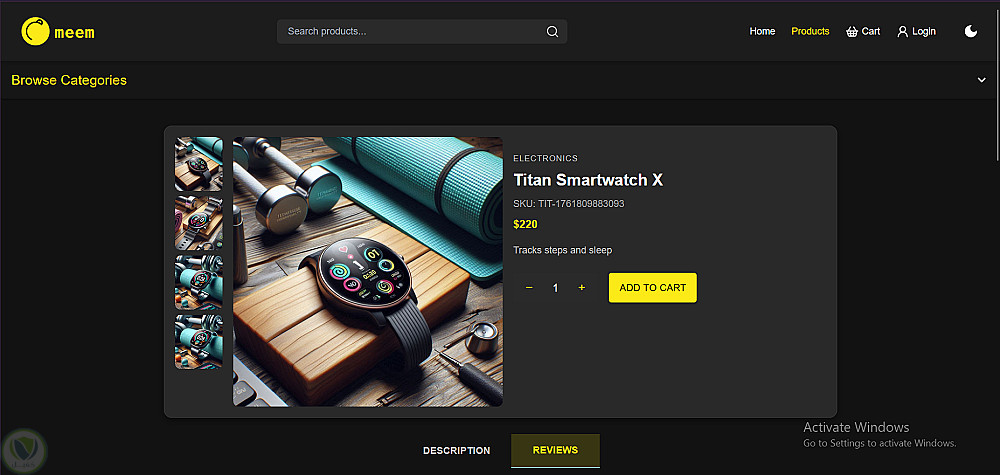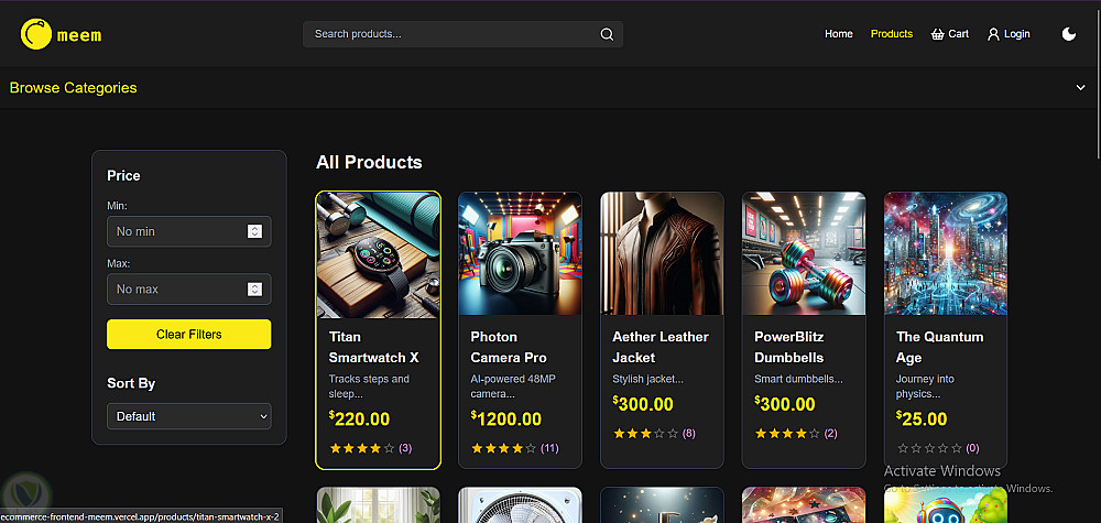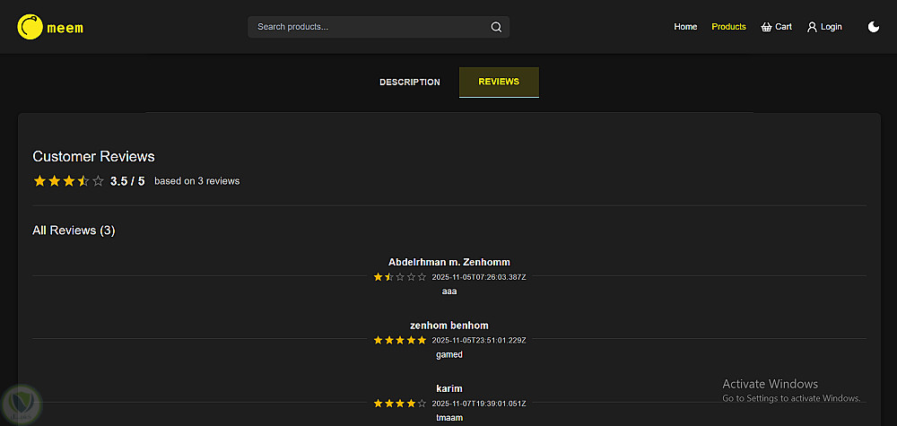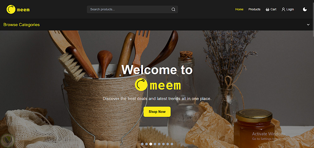 "Meem" هي منصة للتجارة الإلكترونية غنية بالميزات، توفر للمستخدمين تجربة تسوق سهلة وبديهية، بينما تقدم للمسؤولين أدوات قوية لإدارة المنتجات، المستخدمين، والطلبات. يشتمل التطبيق على مصادقة المستخدم، تصفح المنتجات، إدارة سلة التسوق، المراجعات، معالجة الدفع، وتصميم متجاوب (Responsive) يدعم ميزة المظهر الفاتح/الداكن.