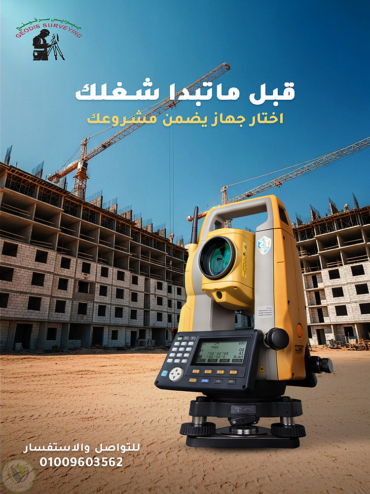 ديزاين سوشيال ميجيا يقوم بعرض جهاز في مجال هندسة المساحة. موجه الى فئة المهندسين وهجقه حثهم على شراء الجهاز "Total Station" من الشركة المعنية بالاضافة الى قطع غيار الجهاز عالية الجودة.
