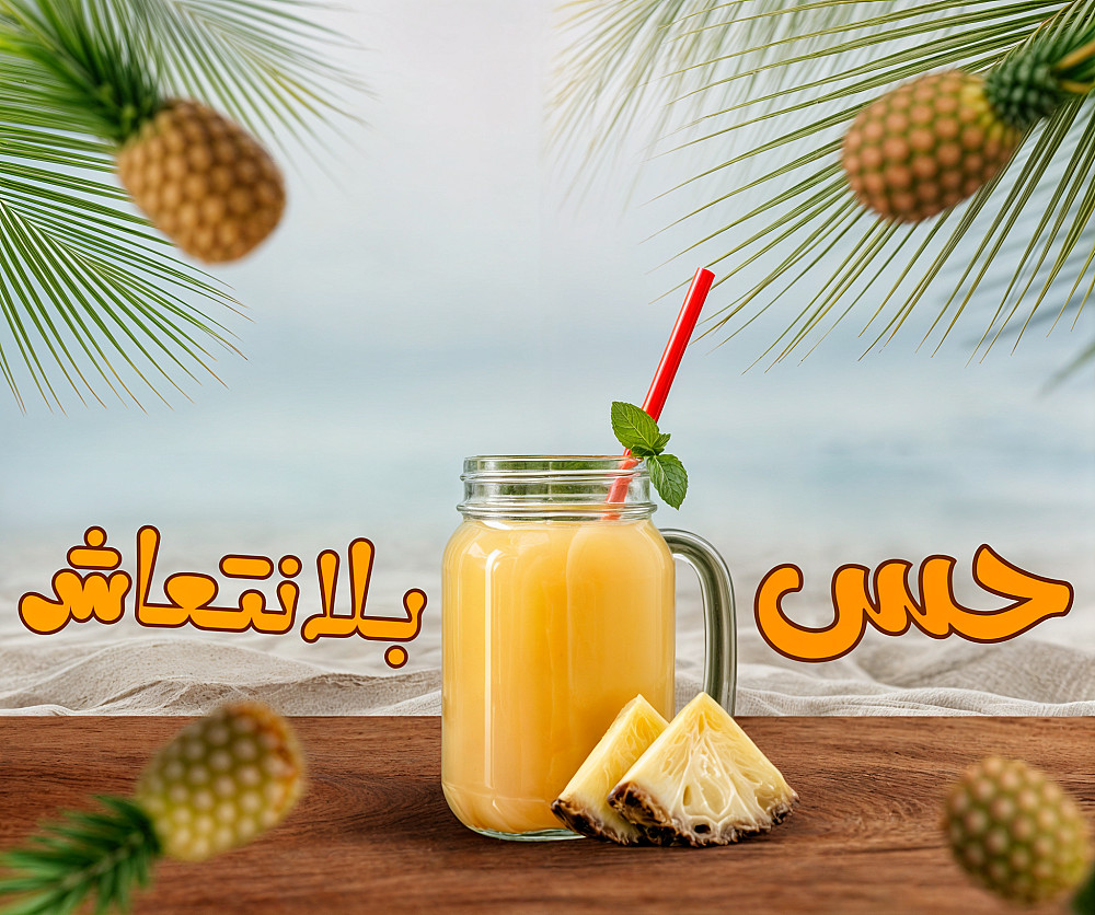 تصميم عصير الأناناس على الرمل بيتميز بجو صيفي استوائي واضح ولمسة منعشة بتجذب العين. في المقدمة، باين كوب عصير أناناس لونه ذهبي لامع، مليان بشرائح فاكهة طازة وثلج مجروش، بيتحط فوق رمال ناعمة بلون ذهبي دافي. ورا الكوب، البحر ظاهر بلونه الأزرق الهادي، والسماء صافية مع ضوء شمس ساطع بيغمر التصميم كله.