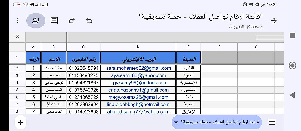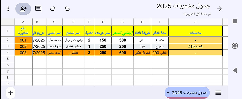 تنسيق احترافي (ألوان - حدود - محاذاة...).