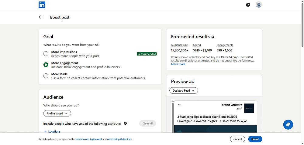 سأقوم بإدارة حملة إعلانية احترافية عبر حسابك على LinkedIn Ads لضمان تفاعل حقيقي مع جمهورك المهني.