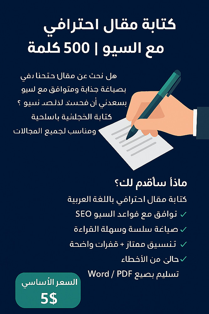 يسعدني أن أقدم لك خدمة كتابة المقالات باللغة العربية بأسلوب واضح ومناسب لجميع المجالات.