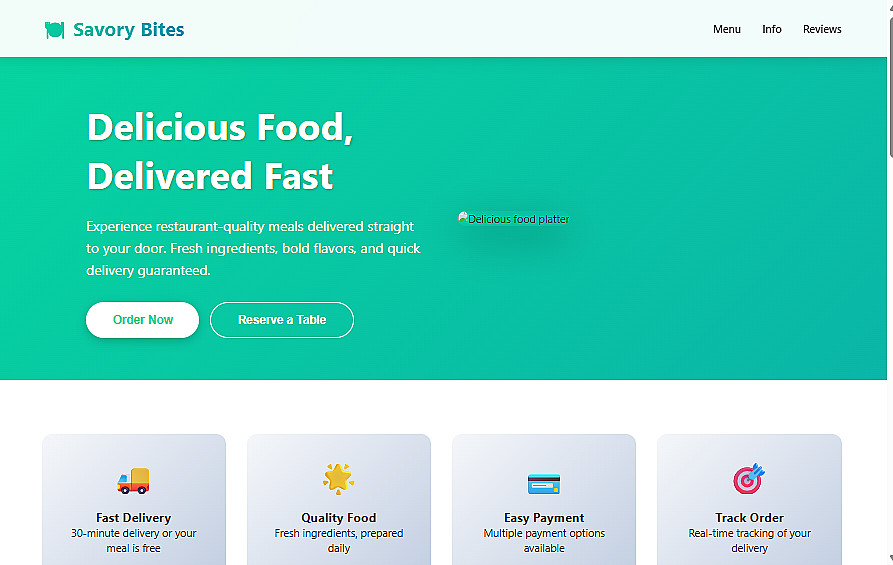 أقدم لك خدمة تصميم صفحة هبوط احترافية لمطعم، كافيه، أو خدمة توصيل، بهدف عرض قائمة الطعام بطريقة جذابة وتحفيز العملاء على الطلب أو الحجز.