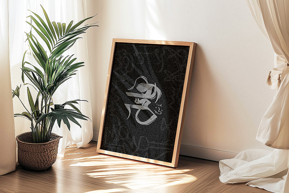 الشعار منفذ يدويًا بلمسة جرافيكية حديثة وتظليل ناعم يضيف عمقًا وثباتًا للبصمة البصرية.