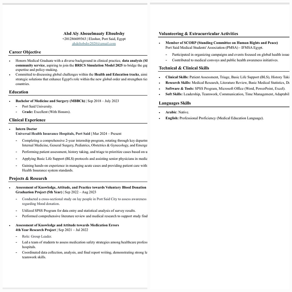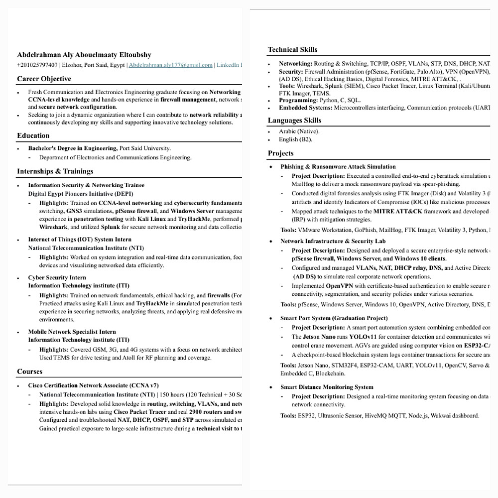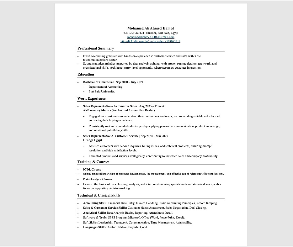 سأصمم لك CV احترافيًا متوافقًا مع الـ ATS يجمع بين التنسيق العصري والكلمات المفتاحية الذكية لإبراز مهاراتك، سواء كنت حديث تخرج أو محترفًا.