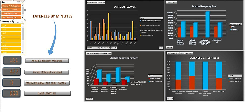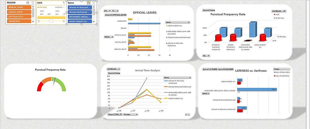 تحليل HR: تتبع الانضباط، الحضور، وتوزيع الإجازات بدقة.