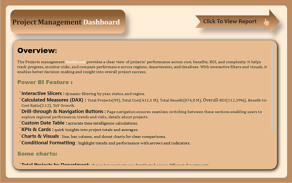 تمثل مكونات المشروع من (صفحات, فلاتر, أزار للتنقل, KPIs, ...الخ) مع شرح مختصر.