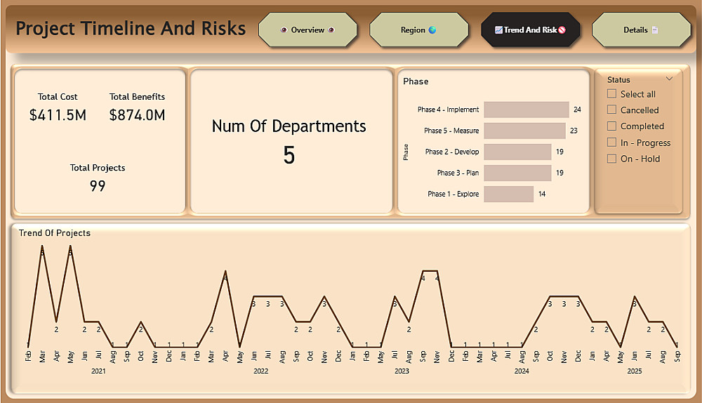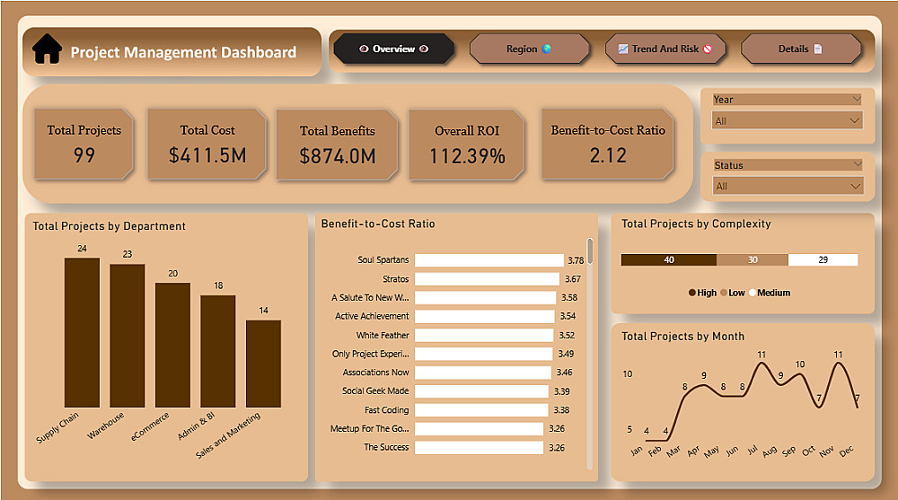 تضم 4–5 كروت لأهم الـMetrics و3–4 رسوم توضيحية مع فلاتر أساسية.