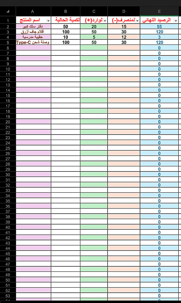 تصميم جدول متكامل: يحتوي على أعمدة (اسم الصنف، الكود، الكمية الواردة، الكمية الصادرة، الرصيد المتبقي).