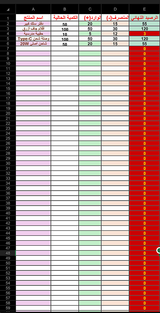 برمجة التنبيه اللوني: برمجة الخلايا لتتغير ألوانها تلقائياً عند نقص الكمية (مثل اللون الأحمر للتنبيه بالطلب).