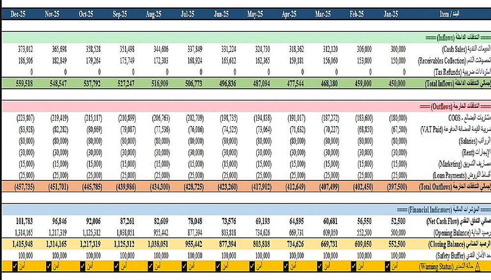 أقدم شيت تدفق نقدي احترافي لمتابعة السيولة بدقة وسهولة، مع إمكانية التخصيص البسيط حسب نشاطك.