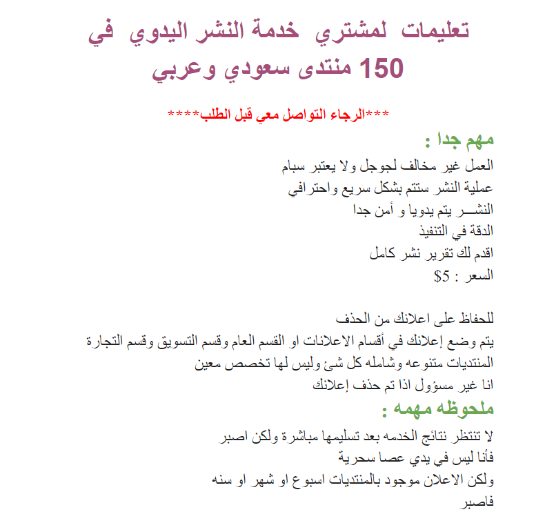 ساقوم بنشر موضوعك او اعلانك في 150 منتدى سعودي وعربي متفاعل .هذه الخدمة موجهة للذي يريد عرض منتجاته او اعلاناته او مواضيعه لسكان الوطن العربي,النشر سيكون يدوي 100 % الموضوع الذي سيتم نشره سيكون منسق في ال 150 منتدى وسيتم ارسال روابط النشر لك .